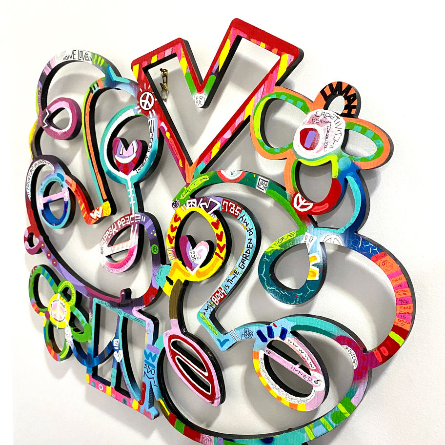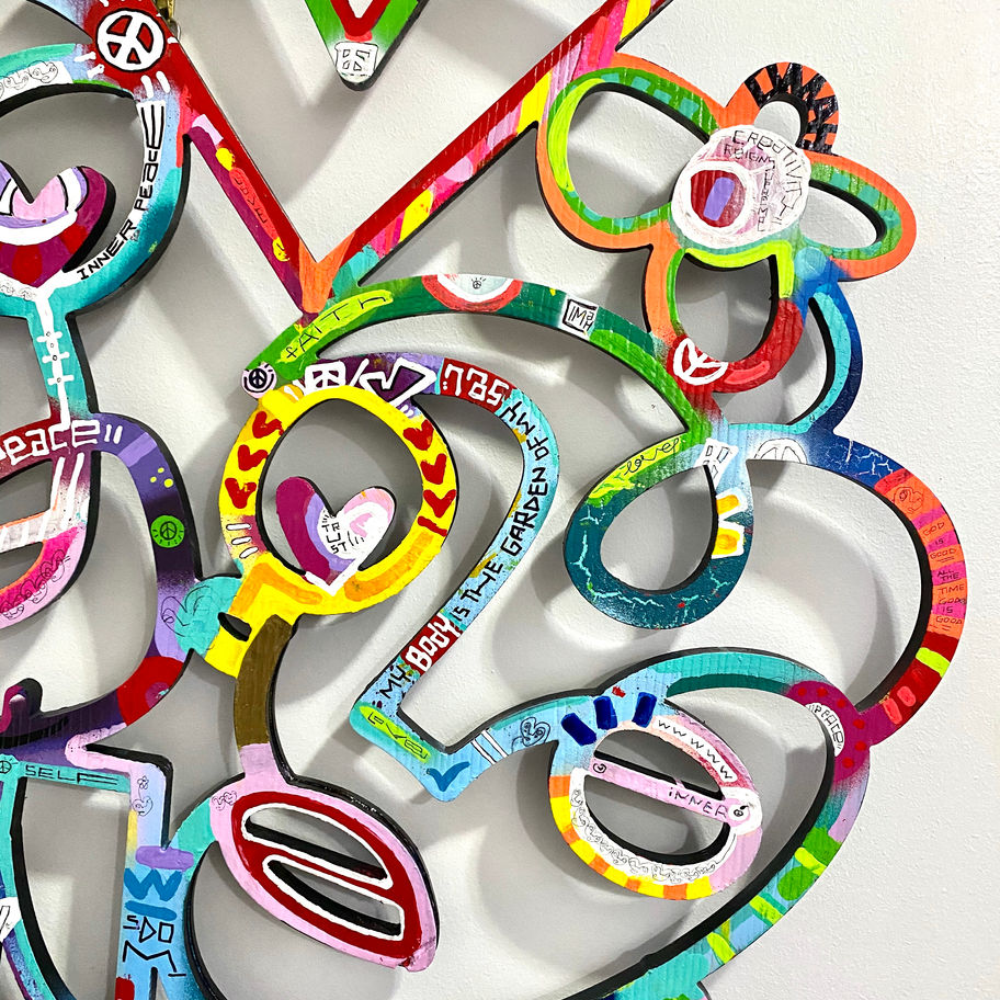 This 27" x 29" decorated piece is made from 1/2" CNC-cut material and was fully designed, painted, and created by hand. The cutout form combined with layered paint brings the design to life with bold shapes, color, and texture.