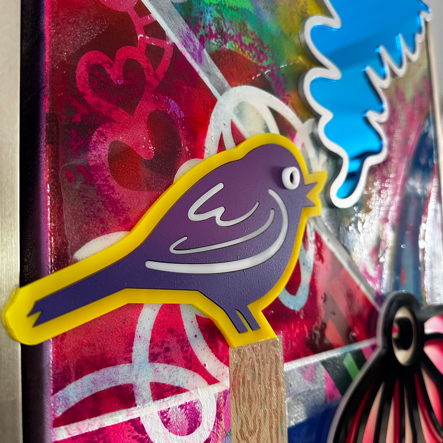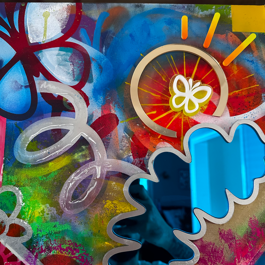 This 18" x 36" mixed media canvas features layered paints, dimensional acrylic, and resin that create rich texture and depth. Inspired by the sights, sounds, and natural flow of the outdoors, the piece captures movement and organic energy. The layered materials reflect the rhythm and beauty found in nature, making it a striking statement piece for any space. Finished with a silver leaf frame.